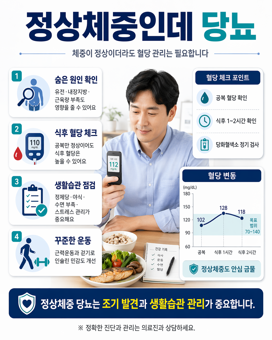 많은 사람들이 당뇨를 떠올리면 가장 먼저 비만이나 과체중을 생각합니다. 실제로 체중이 많이 나가거나 복부비만이 있는 경우 당뇨 위험이 높아질 수 있는 것은 맞습니다. 그래서 건강검진에서 혈당 수치가 높게 나왔을 때도 “나는 정상체중인데 왜?”라는 반응이 자주 나옵니다. 하지만 현실에서는 정상체중인데 당뇨가 발견되는 경우도 적지 않습니다. 겉으로 보기에는 날씬하거나 체중이 표준 범위인데도 공복혈당, 당화혈색소가 높게 나오거나 당뇨 진단을 받는 분들이 분명히 있습니다. 이 말은 곧 당뇨를 단순히 몸무게 문제로만 보면 놓치는 부분이 많다는 뜻입니다. 체중은 중요한 요소 중 하나이지만, 당뇨는 결국 혈당을 조절하는 몸의 대사 기능과 관련된 문제입니다. 그래서 겉보기 체형이 정상이라고 해서 무조건 안전하다고 볼 수는 없습니다. 이번 글에서는 정상체중인데도 당뇨가 생길 수 있는 이유와, 이런 경우 무엇을 더 주의해야 하는지 차분히 정리해보겠습니다.